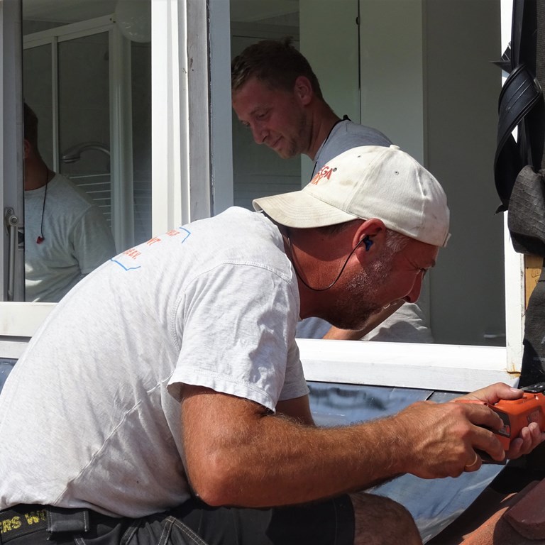 Omdat het huis veel te lijden heeft van het zout na de watersnoodramp, moesten ook alle gipsplaten binnen vervangen worden. Dat ziet er nu weer keurig uit. “Waar ik vooral blij mee ben? De ruimte! En dat het tochtvrij en lekvrij is. Dat is een verademing.”